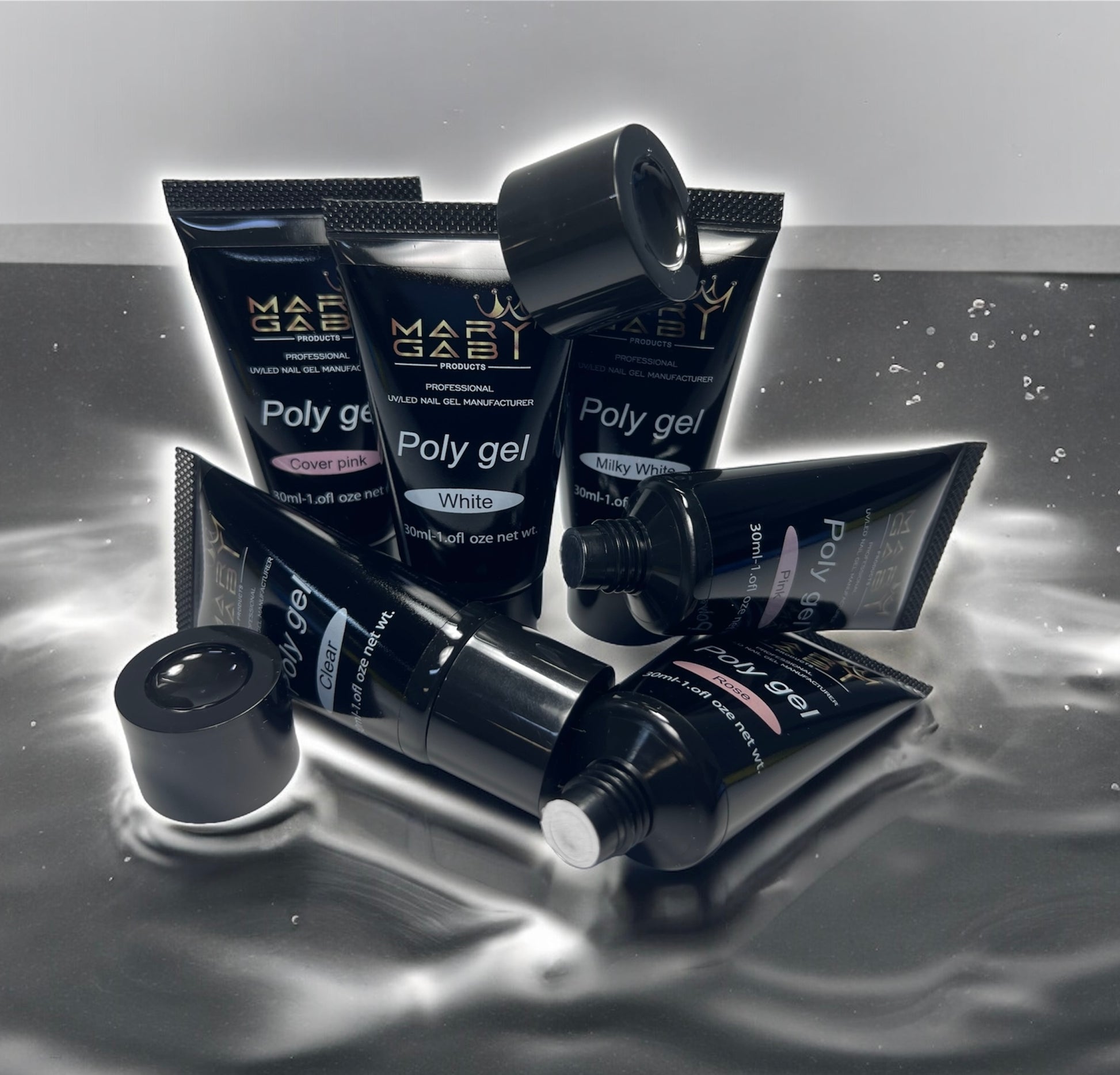 Mary Gaby Productos. Venta de set Poly Gel 30 ml de 6 piezas. Milky White, Cover Pink, Clear, Rose, White, Pink. Son materiales de alta calidad, para realizar la mejor uña a nivel profesional.